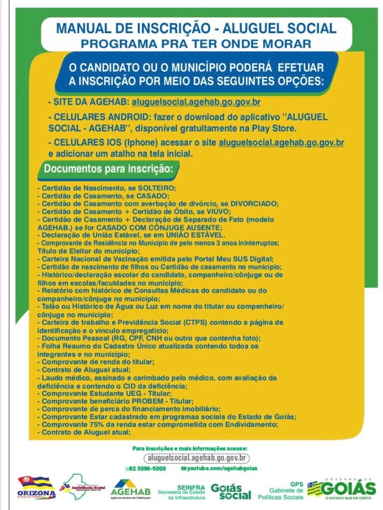 A Agehab, em parceria com o Governo de Goiás, garante auxílio de R$ 350,00 por até 18 meses para famílias em situação de vulnerabilidade social.